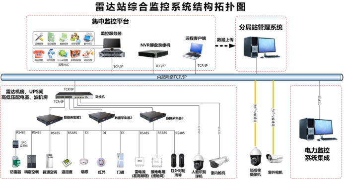 通過建設(shè)雷達(dá)站智能綜合監(jiān)控系統(tǒng)可以對(duì)分布在雷達(dá)站各個(gè)區(qū)域獨(dú)立的動(dòng)力設(shè)備和環(huán)境設(shè)施、安防設(shè)施對(duì)象進(jìn)行遙測、遙信等采集,實(shí)時(shí)監(jiān)視各基礎(chǔ)設(shè)施、安防設(shè)備的運(yùn)行狀態(tài),記錄和處理相關(guān)數(shù)據(jù),及時(shí)偵測故障,并作必要的遙調(diào)、遙控操作,適時(shí)通知管理人員處理,結(jié)合先進(jìn)的視頻監(jiān)控系統(tǒng),對(duì)雷達(dá)站進(jìn)行可視化監(jiān)測,實(shí)現(xiàn)雷達(dá)站的少人、無人值守,以及電源、空調(diào)的集中監(jiān)控維護(hù)管理,提高供電系統(tǒng)的可靠性和通信設(shè)備的安全性,為雷達(dá)站的管理自動(dòng)化、運(yùn)行智能化和決策科學(xué)化提供有力的技術(shù)支持。